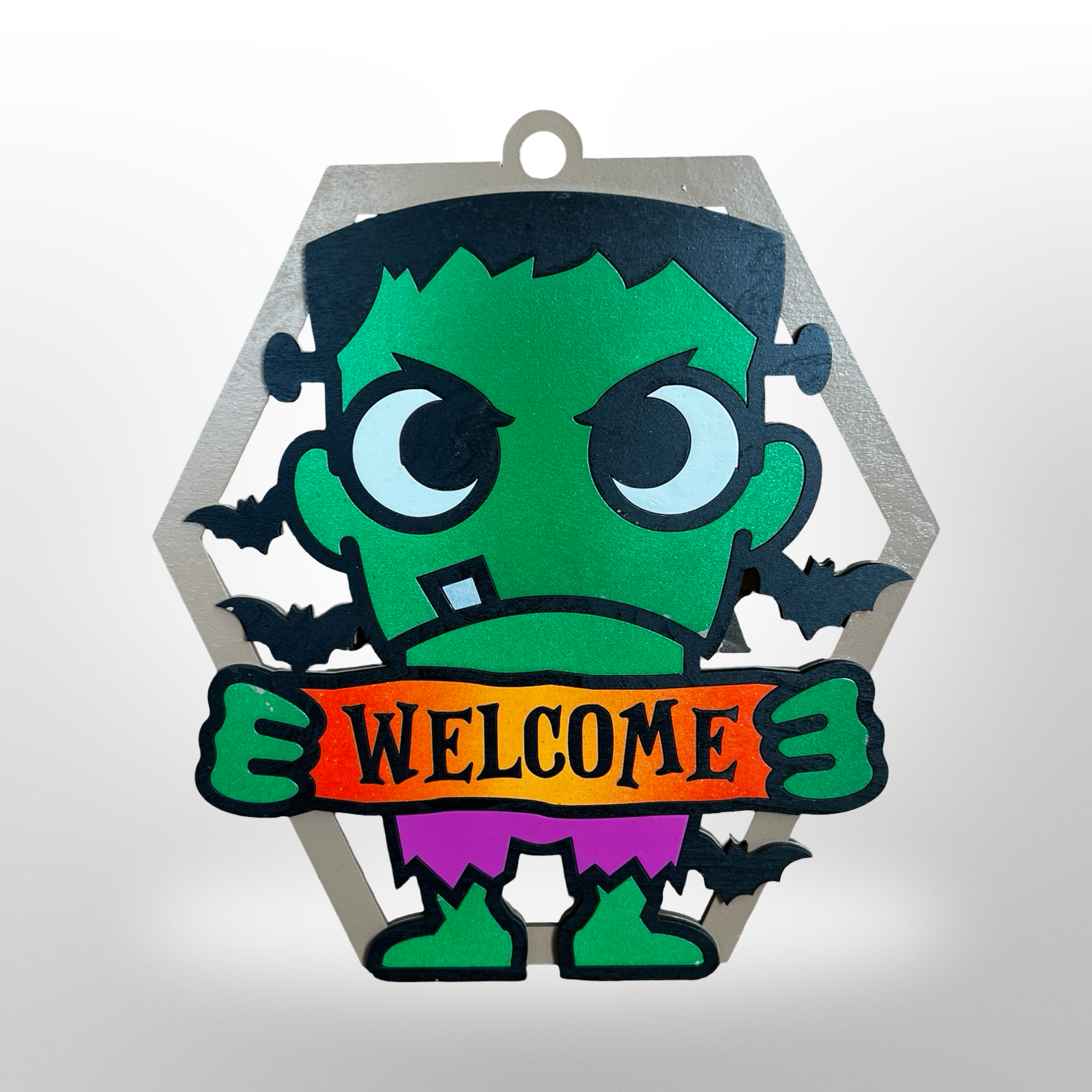 Add a playful fright to your Halloween décor with this laser-cut wood sign featuring a grumpy Frankenstein character and bold “WELCOME” lettering. Hand-painted with vivid seasonal colors and bat accents, each piece is slightly unique and ready to hang.